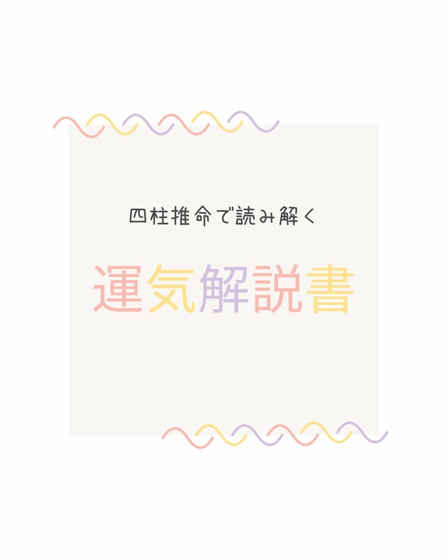 生年月日などから算出した命式と、四柱推命鑑定 運気解説書のセットです。 【セット内容】 ・命式 A4 1枚 ・四柱推命 運気解説書 A4 1枚~ ・運気解説書の見方 ※鑑定書のデザインは変更する場合があります。 この解説書では、ご希望の期間の運気のバイオリズム(どのような運気の中にいるか)ということや、運気や星の巡りに応じてどのように過ごすと良いか(開運行動)について解説致します。 解説してほしい時期について、大運(10年ごとの運気)、年運(1年ごとの運気)、月運(1ヵ月ごとの運気)からお選びいただけますので、ご希望の時期を備考欄にてお知らせください。 3期間・おひとり分のお値段です(例:①年運を今年から3年分、②月運を来月から3か月分、③大運30年分など)。 1か月ごと半年分なら6か月分(3期間+オプション3期間)、10年分の場合は3期間+オプション7期間分のように、3期間分を超える場合はオプションを合わせてご購入ください。 ご自身とパートナーの運気を1枚にまとめる“ペア運気”も対応しております。3年分の場合はご自身の3年+パートナーの3年となるので、基本料+オプション3期間分のご購入をお願い致します。 解説書の下部のメッセージは、お悩みやご相談に合わせておひとりずつにお伝えします。特に鑑定してほしい内容やお悩みがある場合は、備考欄にてお伝えください。 ご注文の際は、命式を出すための必要事項を注文時に備考欄へご記入ください。 ①鑑定書に記載するお名前(ニックネーム可) ②生年月日 ③性別 ④運気を見てほしい時期(今年から3年間、来月から半年間など、具体的にお願い致します)。 ※⑤特に鑑定してほしいこと、お悩みなど(※任意です) ※⑥出生地・出生時間(※任意です。より詳しく命式をお出しすることができますが、鑑定には使用しない範囲ですので、入力の有無で料金は変わりません。入力する場合、出生地は市町村までお願いいたします。日本以外でお生まれの場合は、ずれが生じて鑑定結果がしっくりこない場合もございます。利用しているシステム上、日本以外の都市は反映できないのでご了承ください)。 占う期間のご相談やオプションの計算方法などについてのお問い合わせは、ショップのCONTACTページもしくはInstagramのDMでも受け付けております。お気軽にご相談くださいませ。 オプションで生涯年運表(120年分)・年運バイオリズム一覧表セットもお付けできます。こちらは年運バイオリズム一覧を参考に、ご自身で年運を見たい方にお勧めです。 年運バイオリズムの一覧(どのような運気の中にいるか)についてはお付けいたしますが、どのように過ごせばよいか(開運行動)についての解説はついておりませんのでご注意ください。 [キーワード:運気、天中殺、開運、開運行動、バイオリズム]