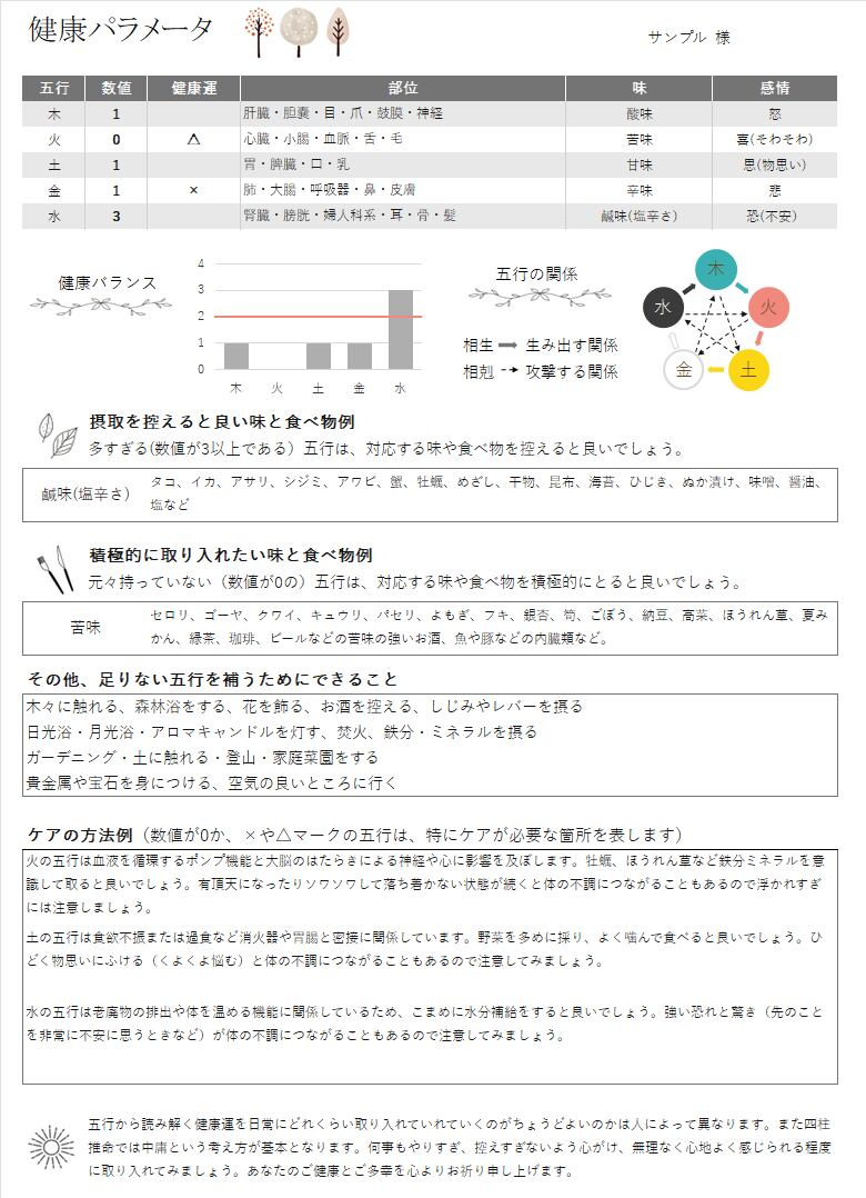 生年月日などから算出した命式と、プチ鑑定書(健康パラメータ)のセットです。