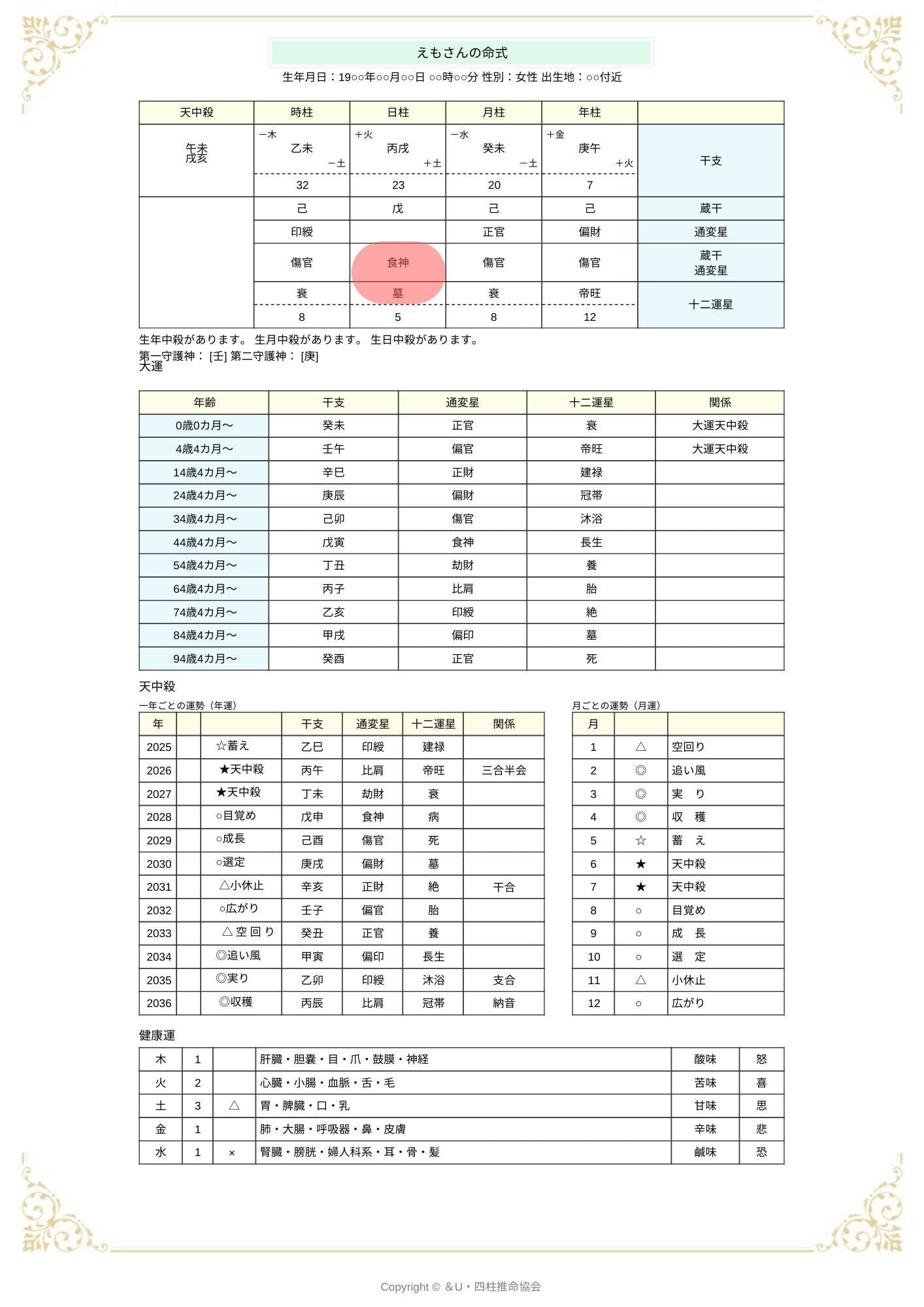 命式のうち日柱の蔵干通編星・十二運星からプライベート・恋愛・結婚について読み解きます(結婚や出会いの時期を特定するものではありません。商品画像よりサンプルをご確認ください)。