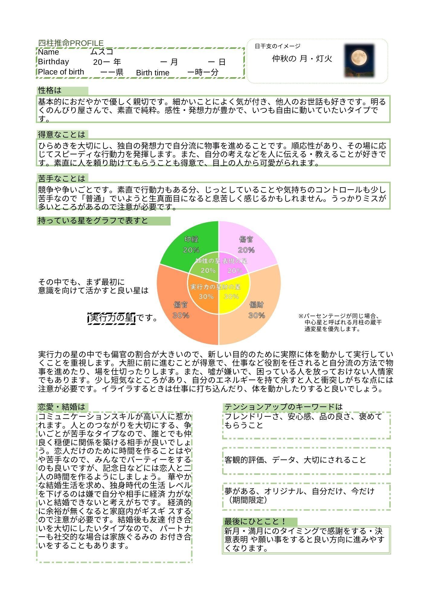 生年月日などから算出した命式と、四柱推命プロフィールのセットです。