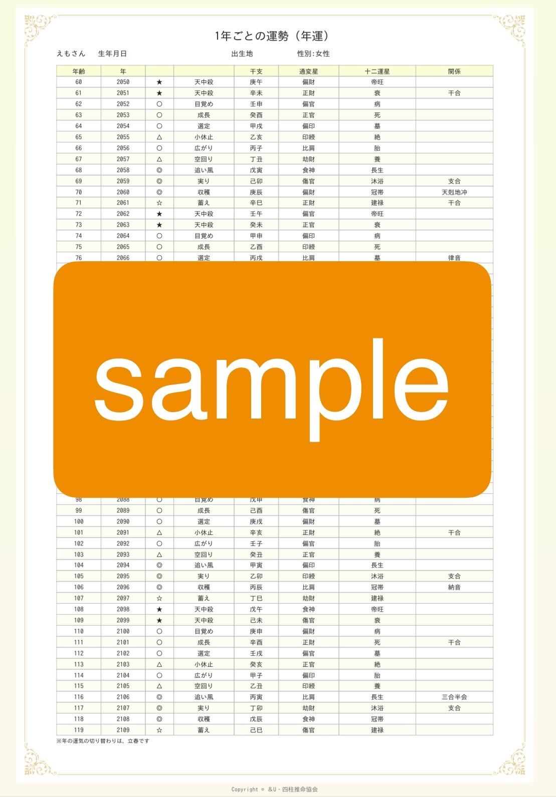 生年月日などから算出した命式と、120年分の生涯年運表、年運バイオリズム一覧表のセットです。
